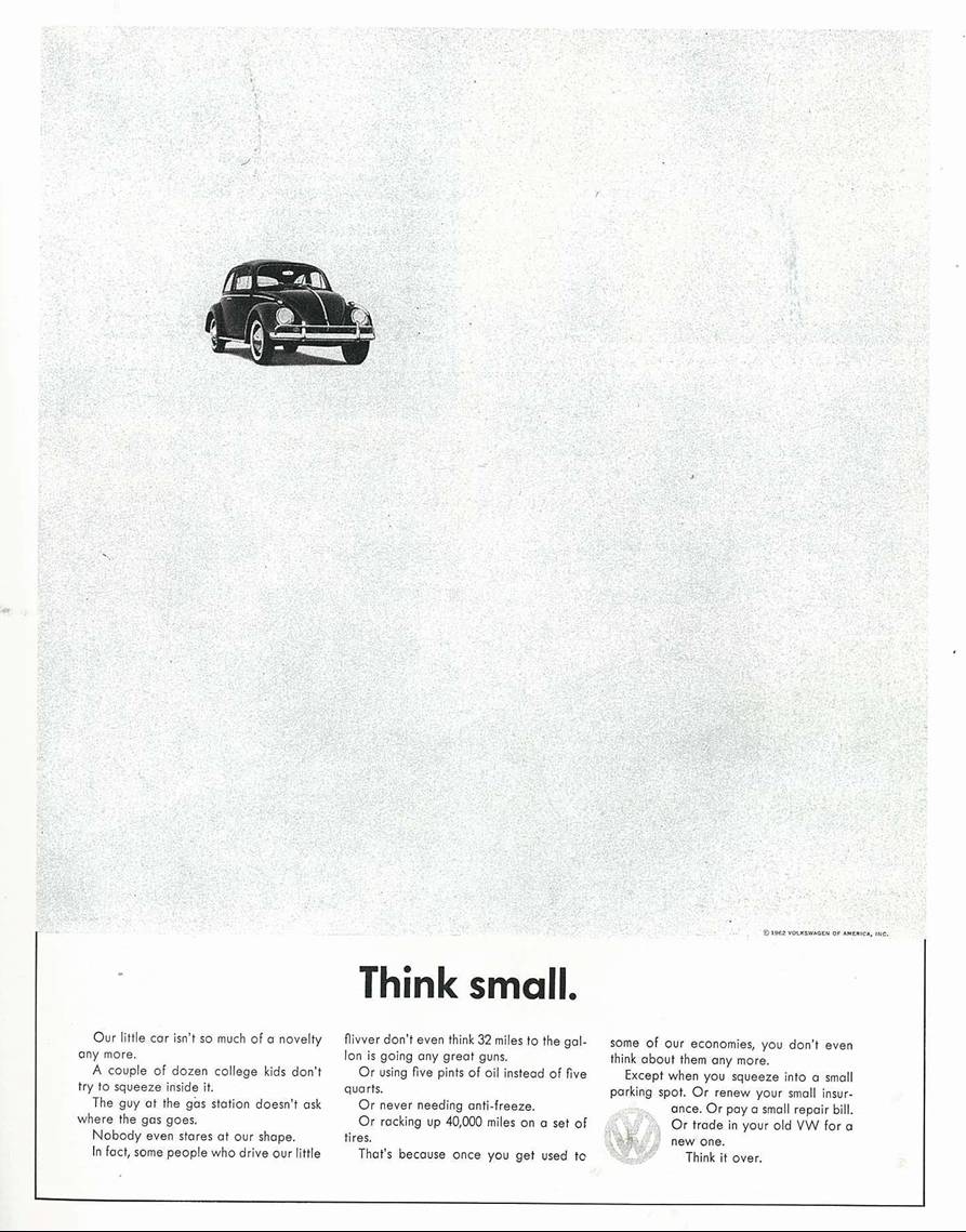 El reto de Volkswagen era mayor que el de sus competidores. Tenían que conseguir vender en EEUU un coche europeo, fabricado por la Alemania Nazi y de un tamaño más pequeño del que los consumidores americanos estaban acostumbrados. Así que Helmut se centró en el hecho diferencial que era el tamaño y lo aplicaron a una brillante idea creativa. No necesitaron usar todo el espacio disponible del soporte publicitario, ya que dejar el espacio en blanco les ayudaría a comunicar el mensaje.